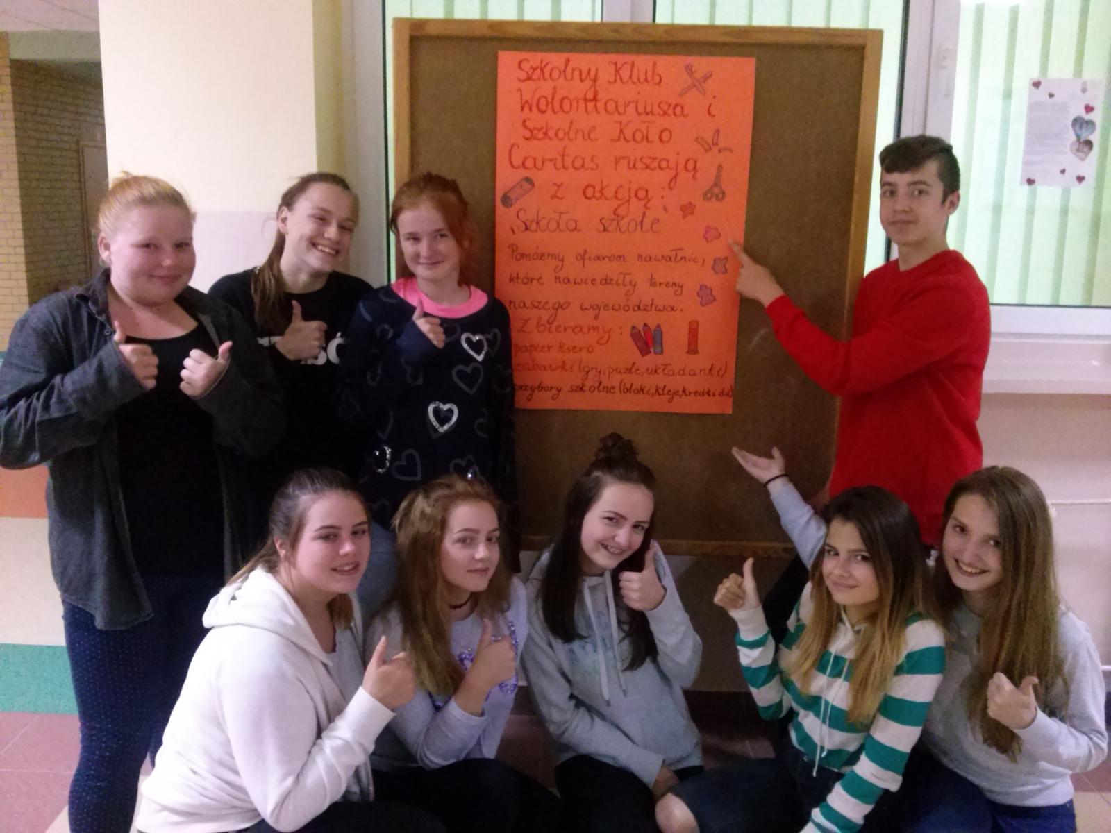 Uczniowie Szkoły Podstawowej im. mjra Henryka Sucharskiego w rozpoczęli akcję SZKOŁA SZKOLE, która ma na celu niesienie pomocy dzieciom, których szkoły lub przedszkola ucierpiały podczas niedawnych nawałnic.