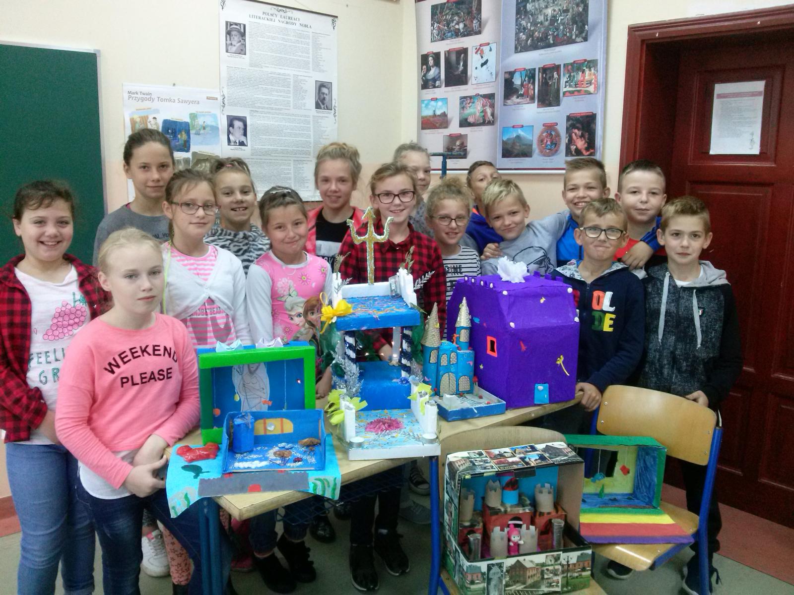 Uczniowie klasy V b Szkoły Podstawowej w Jezierzycach na lekcji języka polskiego, podczas której realizowane były tematy dotyczące mitycznego świata, projektowali i budowali podwodny pałac Posejdona, władcy mórz.