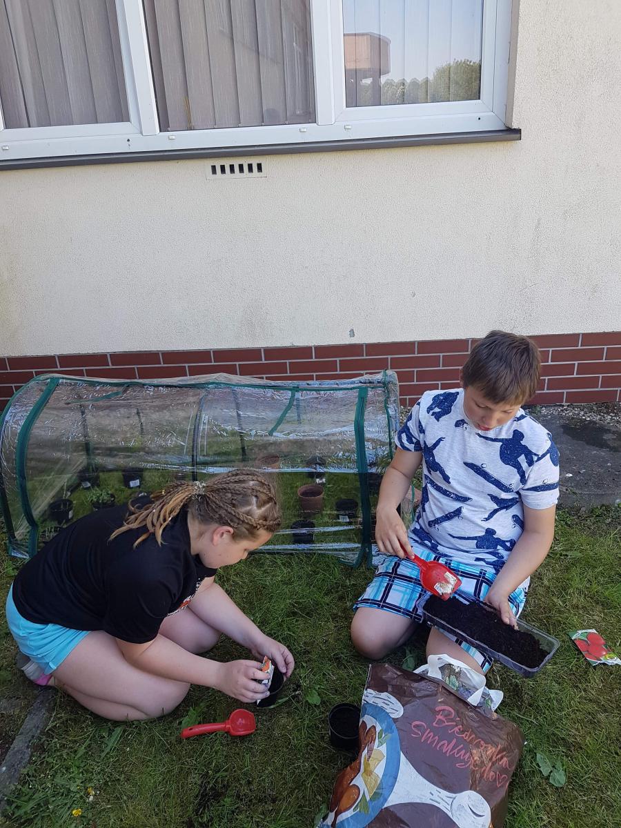 Posadzili sałatę, marchewkę, groszek i rzodkiewkę. Aby przyśpieszyć uprawę roślin i ochronić je przed szkodliwymi warunkami zewnętrznymi, przykryli warzywa tunelem ogrodniczym. Teraz codziennie ich doglądają, podlewają i czekają na pierwsze plony.