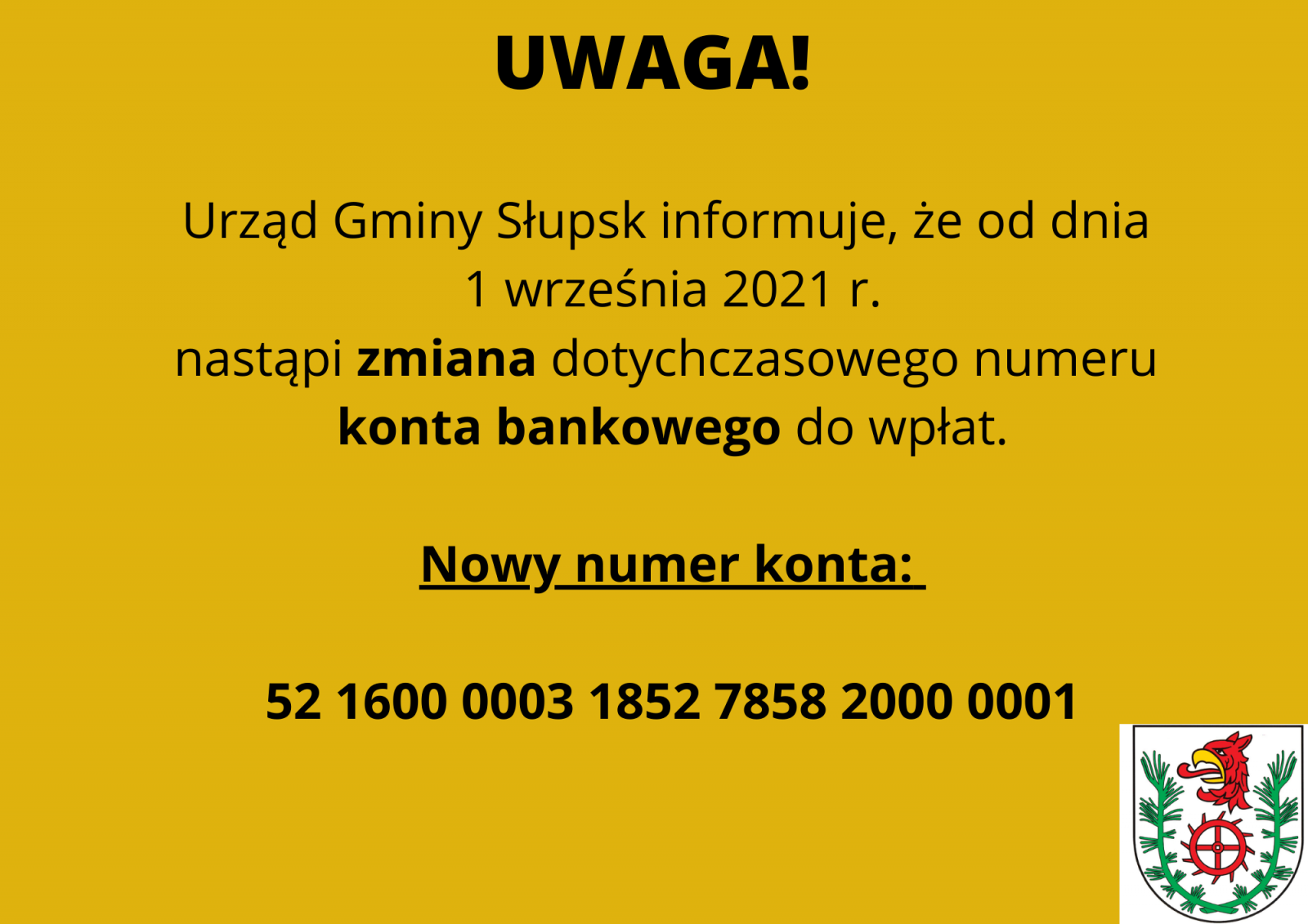 Urząd Gminy Słupsk informuje, że od dnia 1 września 2021 r. nastąpi zmiana dotychczasowego numeru konta bankowego do wpłat. Nowy numer konta: 52 1600 0003 1852 7858 2000 0001