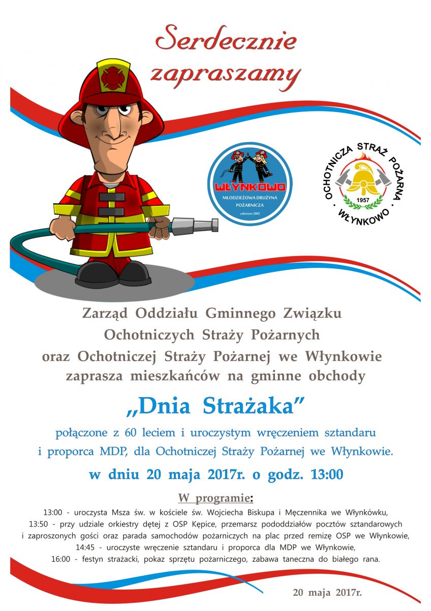 Zarząd Oddziału Gminnego Związku Ochotniczych Straży Pożarnych oraz Ochotniczej Straży Pożarnej we Włynkowie, serdecznie zaprasza na gminne obchody Dnia Strażaka, połączone z 60 - leciem jednostki OSP we Włynkowie oraz nadaniem sztandaru i proporca MDP dla Ochotniczej Straży Pożarnej we Włynkowie. Zapraszamy, Włynkowo 20 maja (sobota) godz. 13.00. Szczegóły na plakacie.
