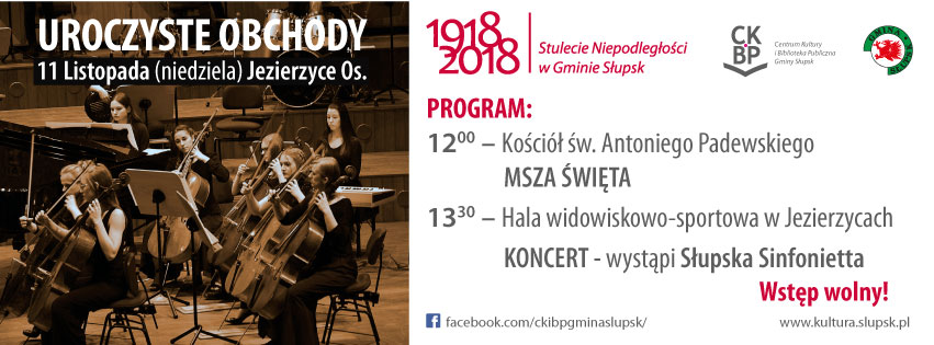 13:30 - Koncert "Śpiewamy dla Niepodległej" (Hala Widowiskowo-Sportowa) w wykonaniu zespołów działających przy Centrum Kultury i Biblioteki Publicznej Gminy Słupsk: Świtezianek, Bierkowianek, Iskierek, Zeppelinek, Świerszczy, Chóru Pasjonata z towarzyszeniem orkiestry symfonicznej Słupska Sinfonietta oraz chórów: Kantele i Fantazja pod dyrekcją Macieja Banachowskiego.