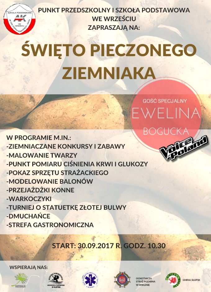 Punkt Przedszkolny i Szkoła Podstawowa we Wrześciu serdecznie zapraszają na Święto Pieczonego Ziemniaka. Start 30 września 2017 roku o godzinie 10:30