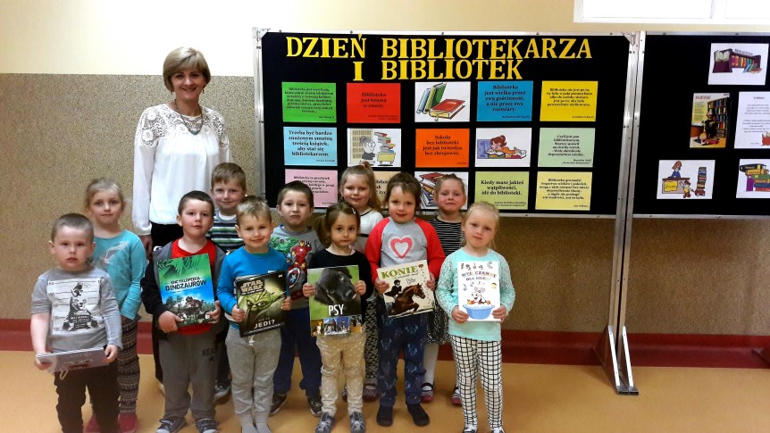 Z okazji Dnia Bibliotekarza i Bibliotek życzymy poczucia spełnienia w pracy, ciekawych pomysłów i energii w krzewieniu kultury oraz coraz większej rzeszy czytelników odwiedzających bibliotekę”. W podziękowaniu Pani Marzena przeczytała przedszkolakom kilka znanych wyliczanek oraz wypożyczyła książki, które wzbudziły ich zainteresowanie.