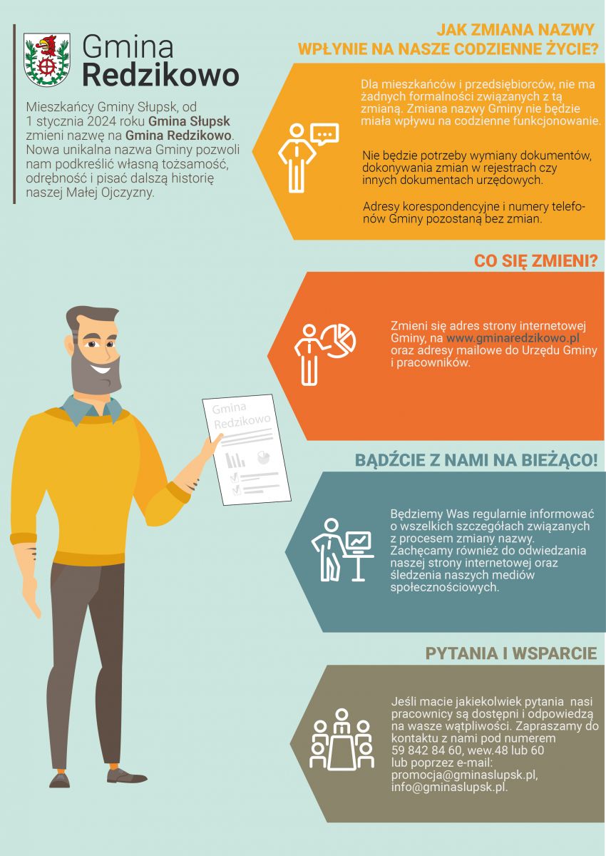Od 1 stycznia 2024 roku Gmina Słupsk zmieni nazwę na Gmina Redzikowo. Dla mieszkańców i przedsiębiorców, nie ma żadnych formalności związanych z tą sytuacją. Zmiana nazwy Gminy nie będzie miała wpływu na codzienne funkcjonowanie. Zapraszamy na stronę www.gminaredzikowo.pl